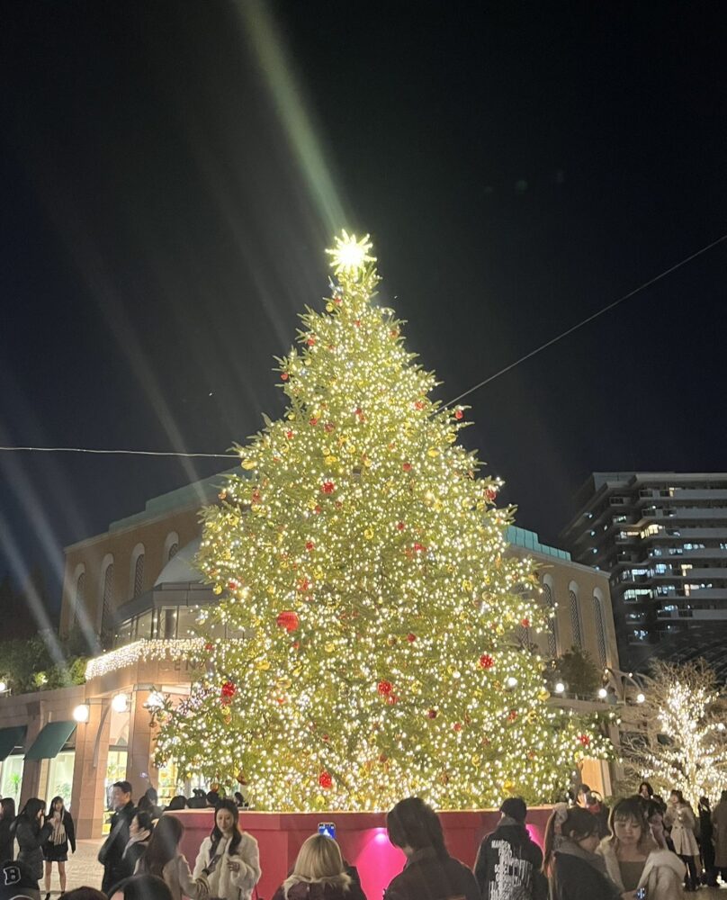 見上げるほど立派なツリーは、無数のあたたかな光に包まれていて、てっぺんの星が夜空に向かってまっすぐ輝いていました。周りにはたくさんの人が集まっていて、それぞれがスマホを構えたり、笑顔で話したり。冬の冷たい空気の中に、クリスマスならではの高揚感が漂っていました。
